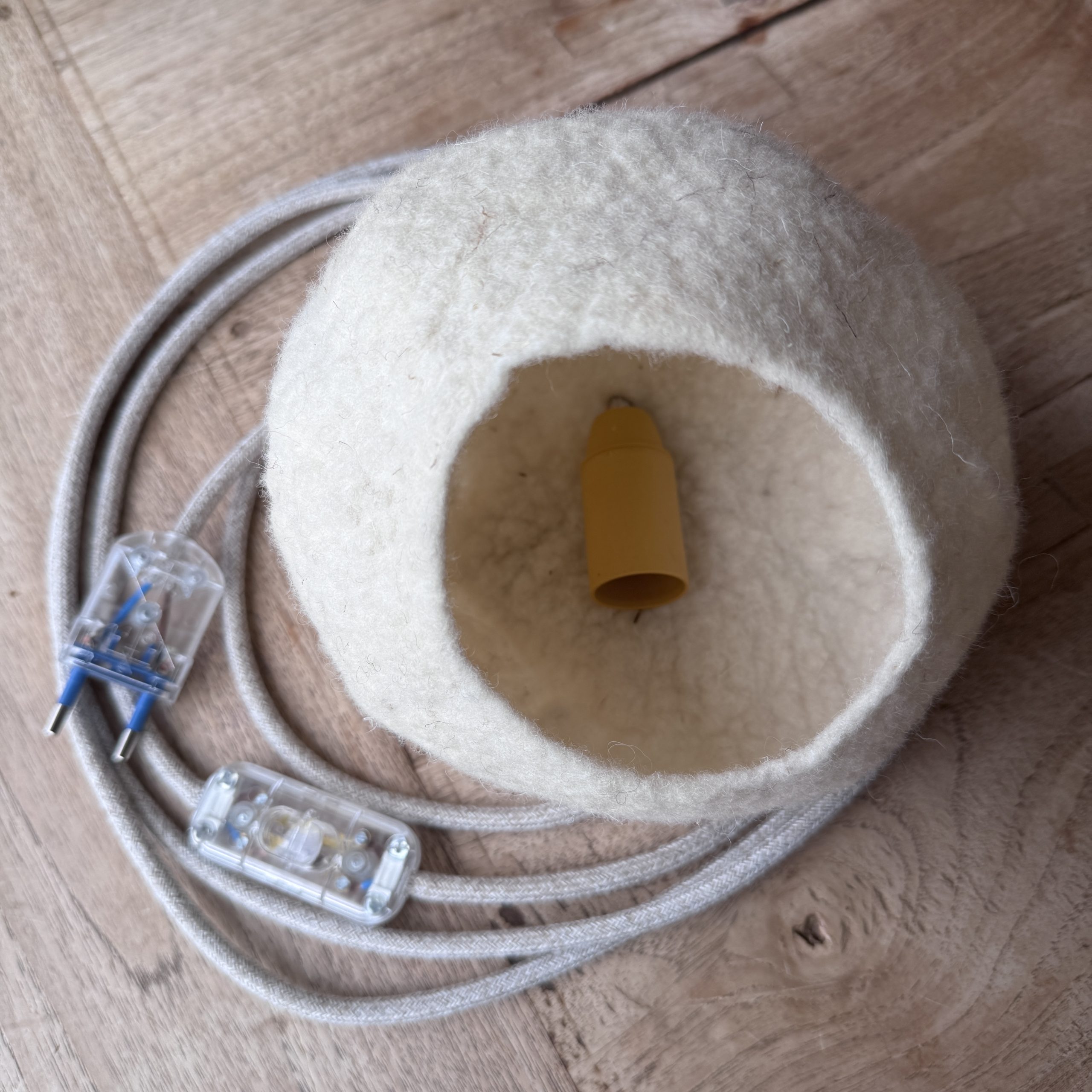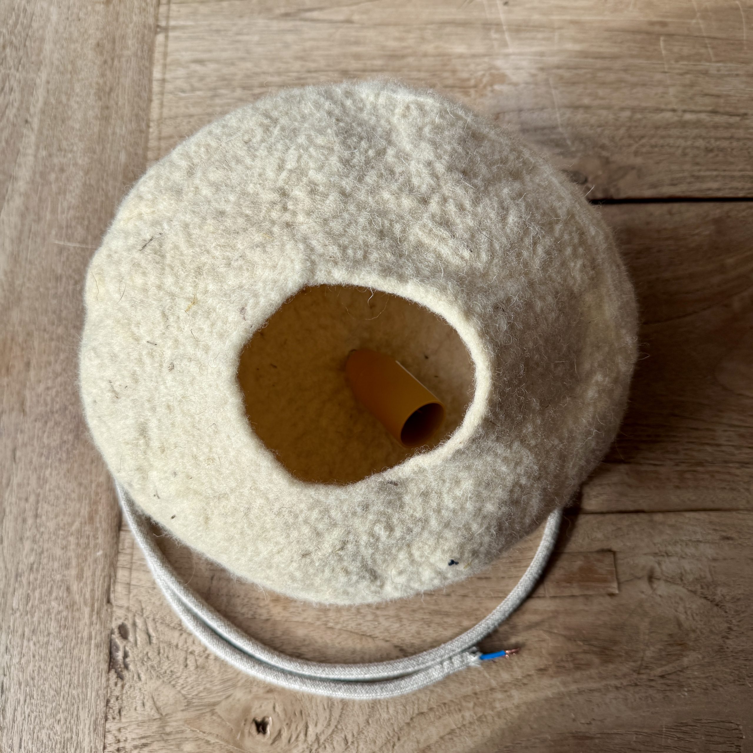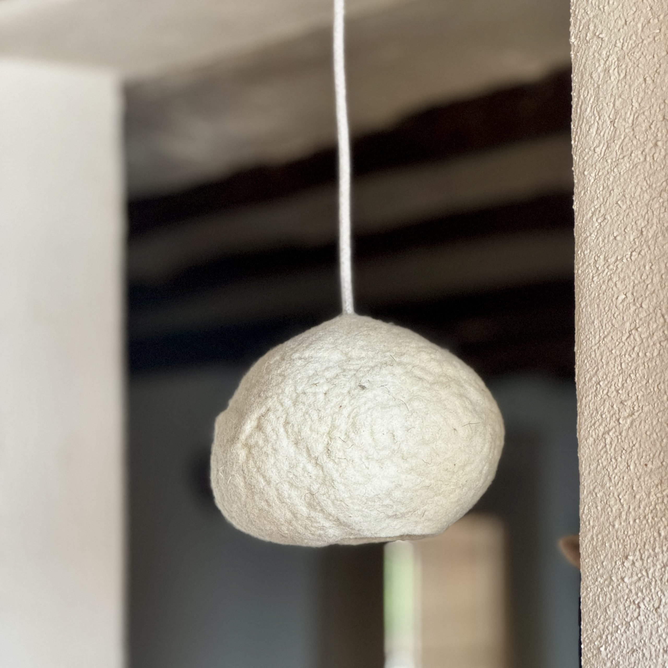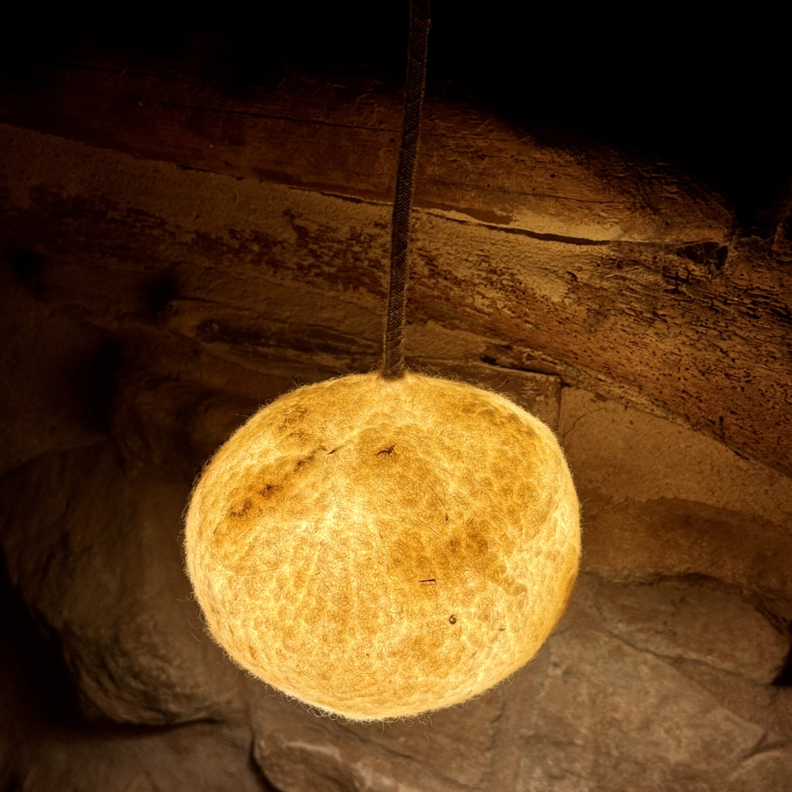- Pantalla esfèrica de llana d’ovella enfeltrada – Diàmetres disponibles: [petit: 15/17 cm] / [gran: 22/24cm]