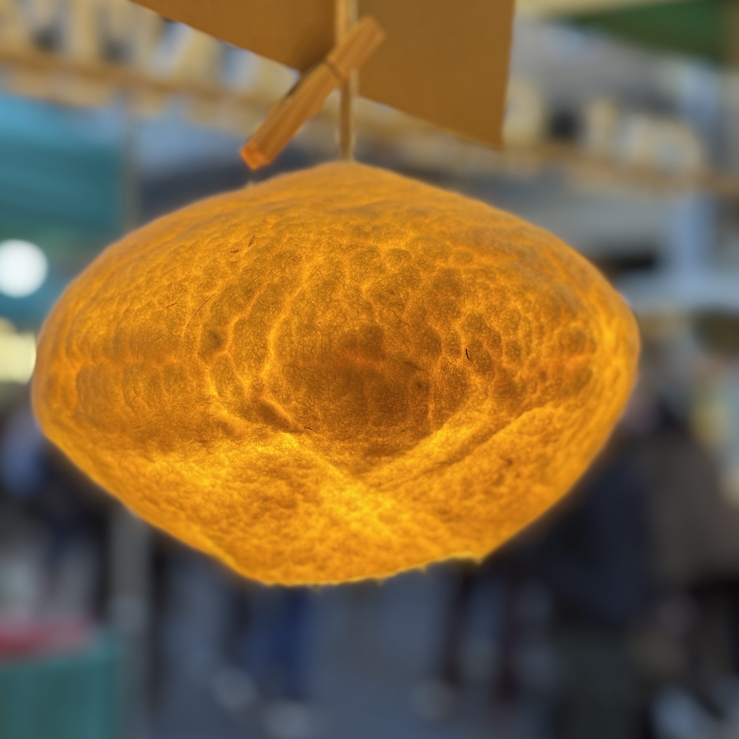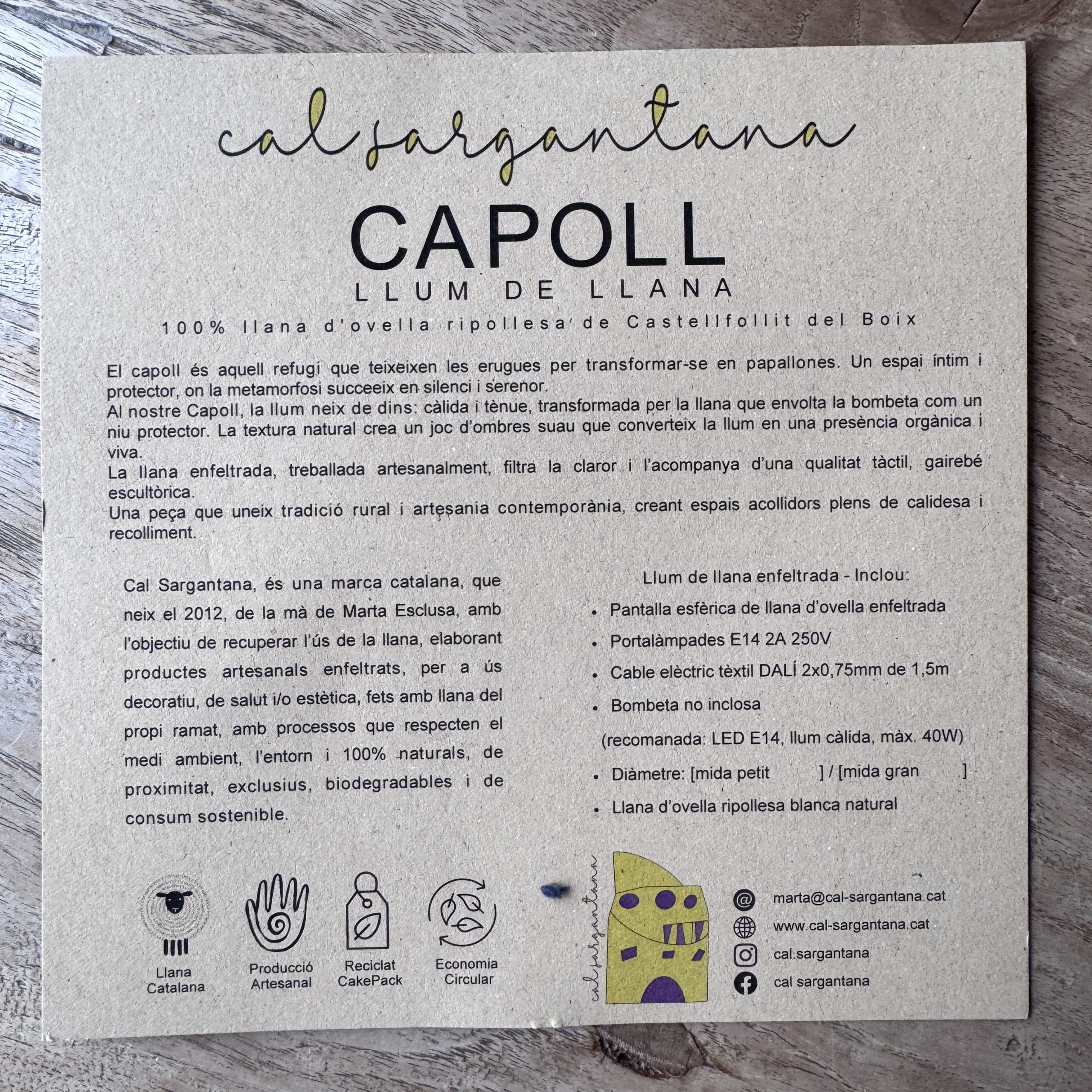 Des de l’interior del Capoll, la llum emergeix càlida, tènue i viva, com un batec suau. La llana d’ovella ripollesa, enfeltrada artesanalment, embolcalla la bombeta com un niu protector. La seva textura natural filtra la claror i dibuixa ombres que conviden al descans i la reflexió.