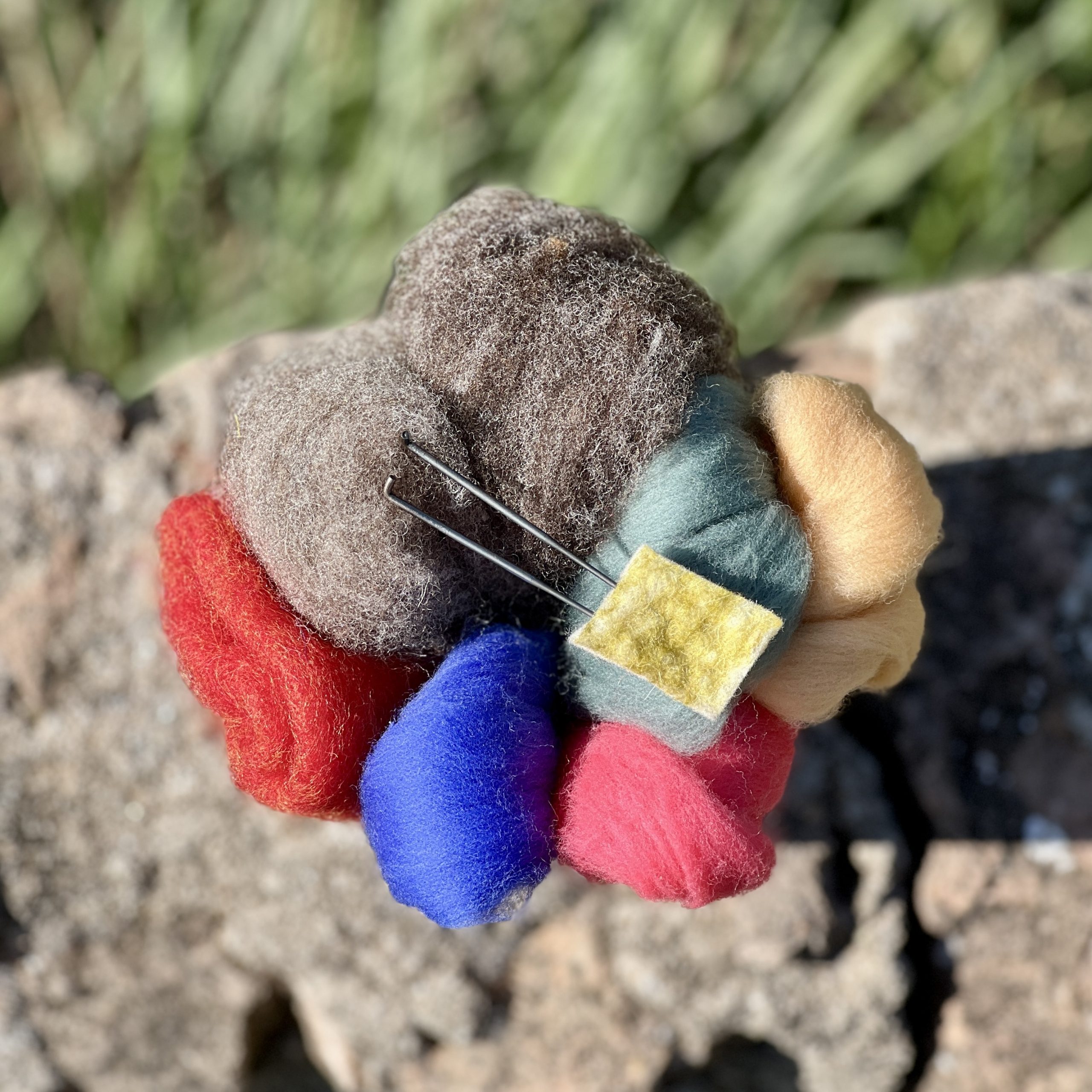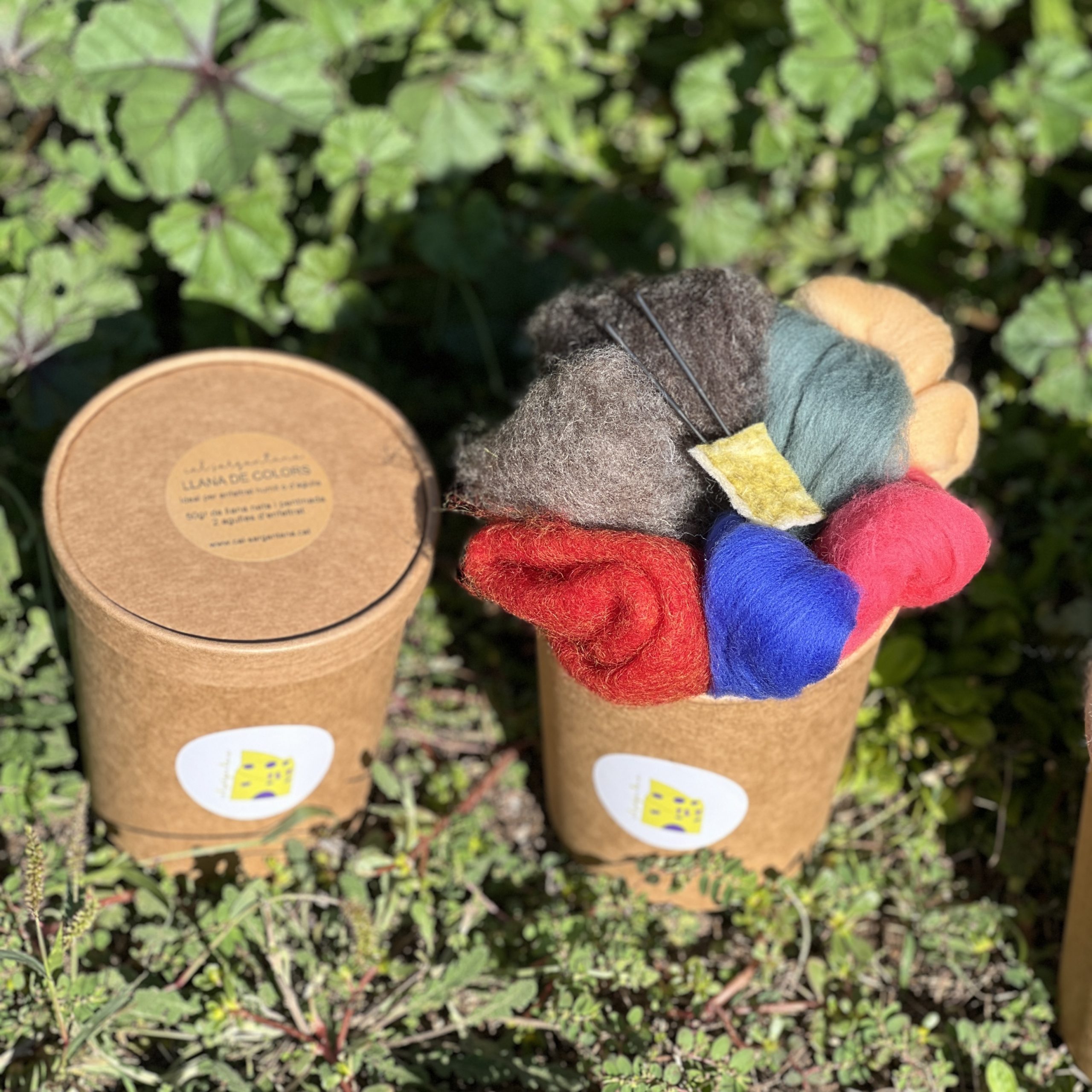Aquest pot conté 50 g de llana de colors, i dues agulles per enfeltrar.