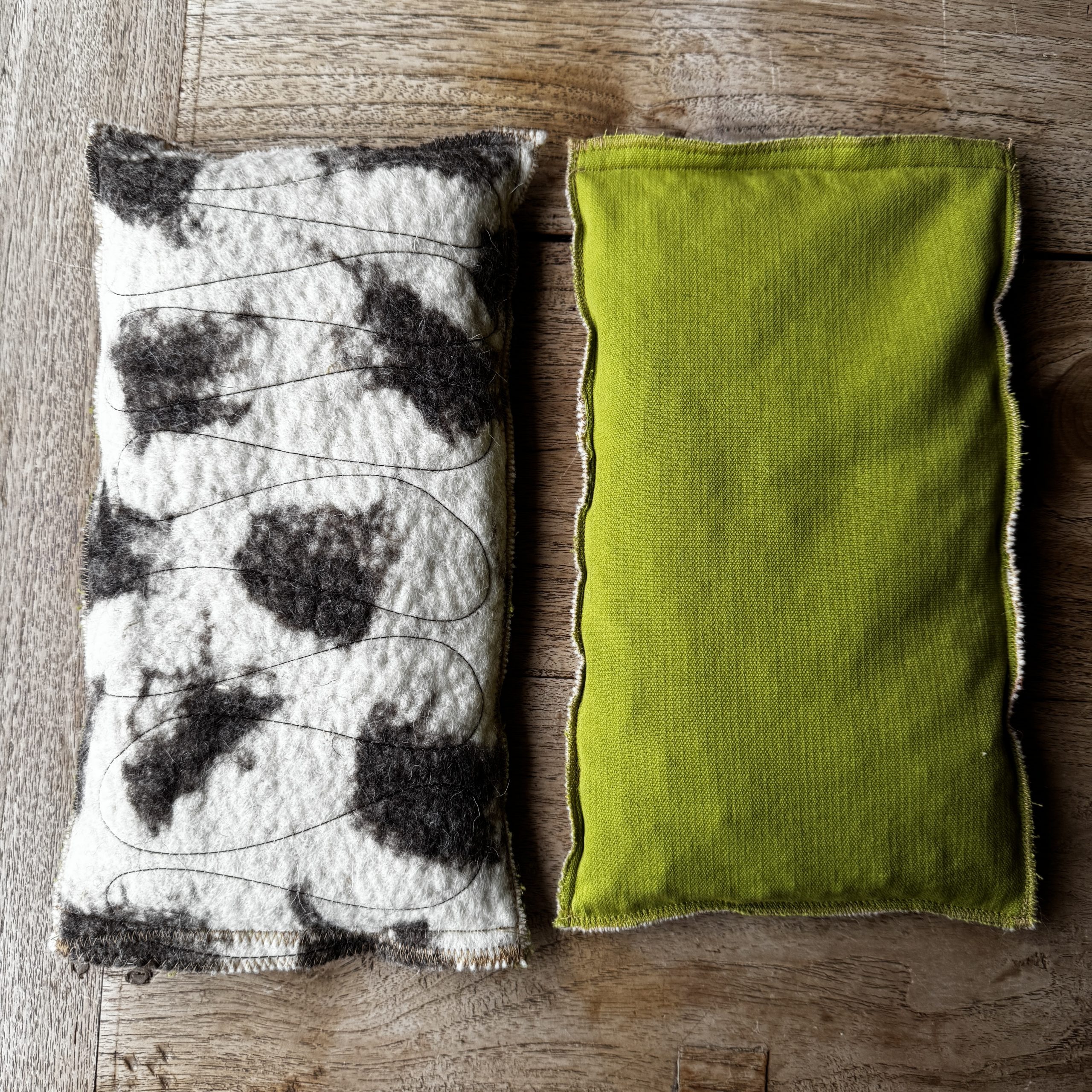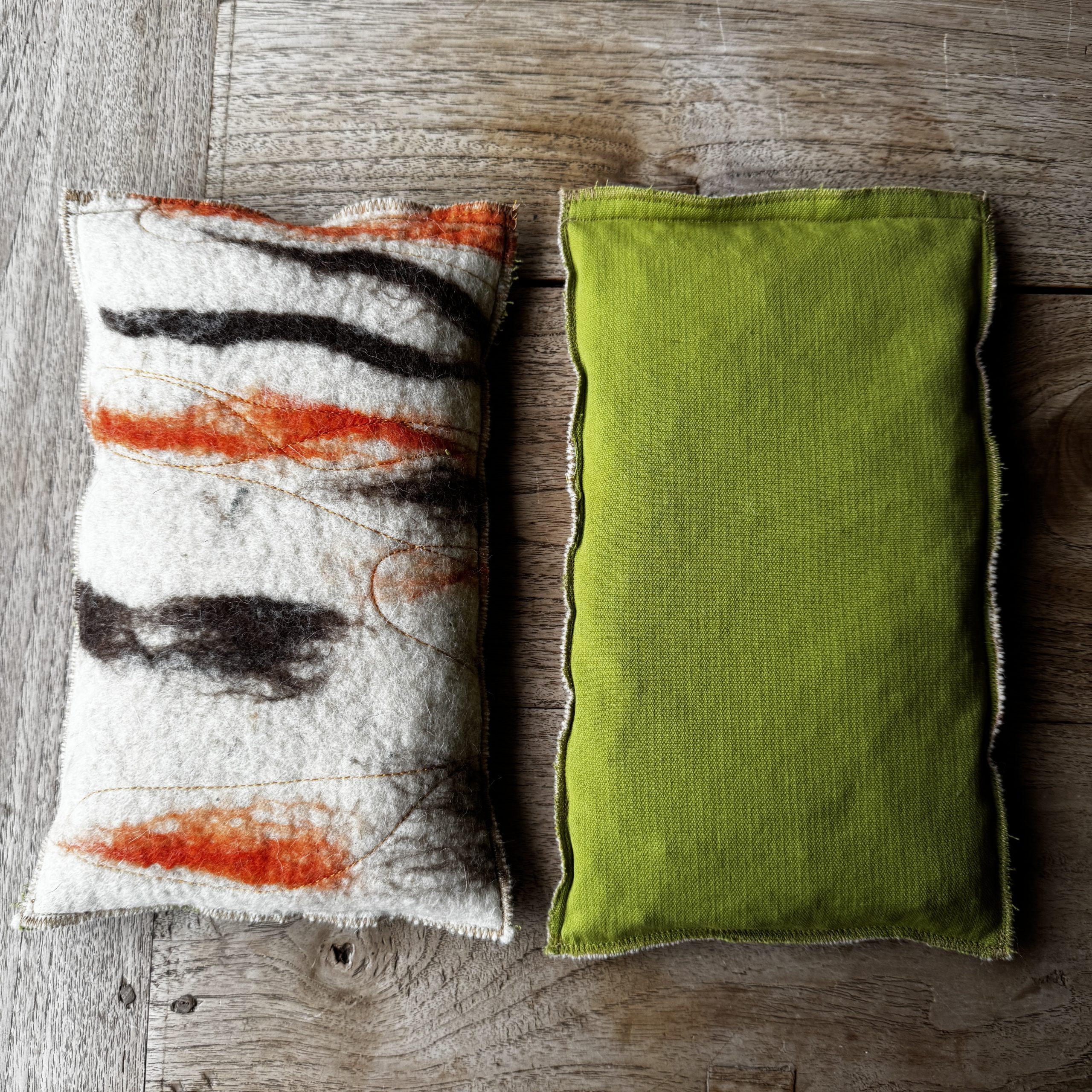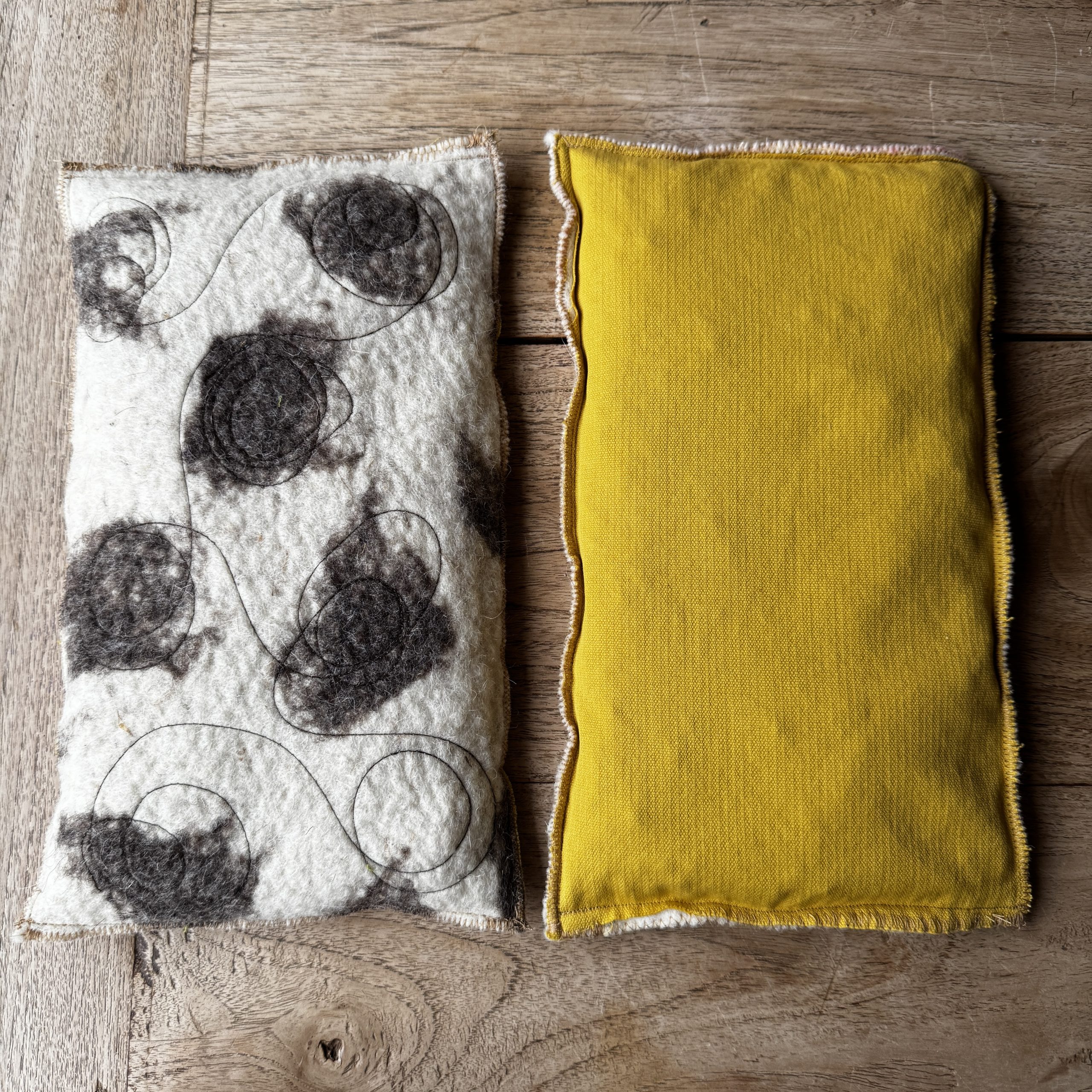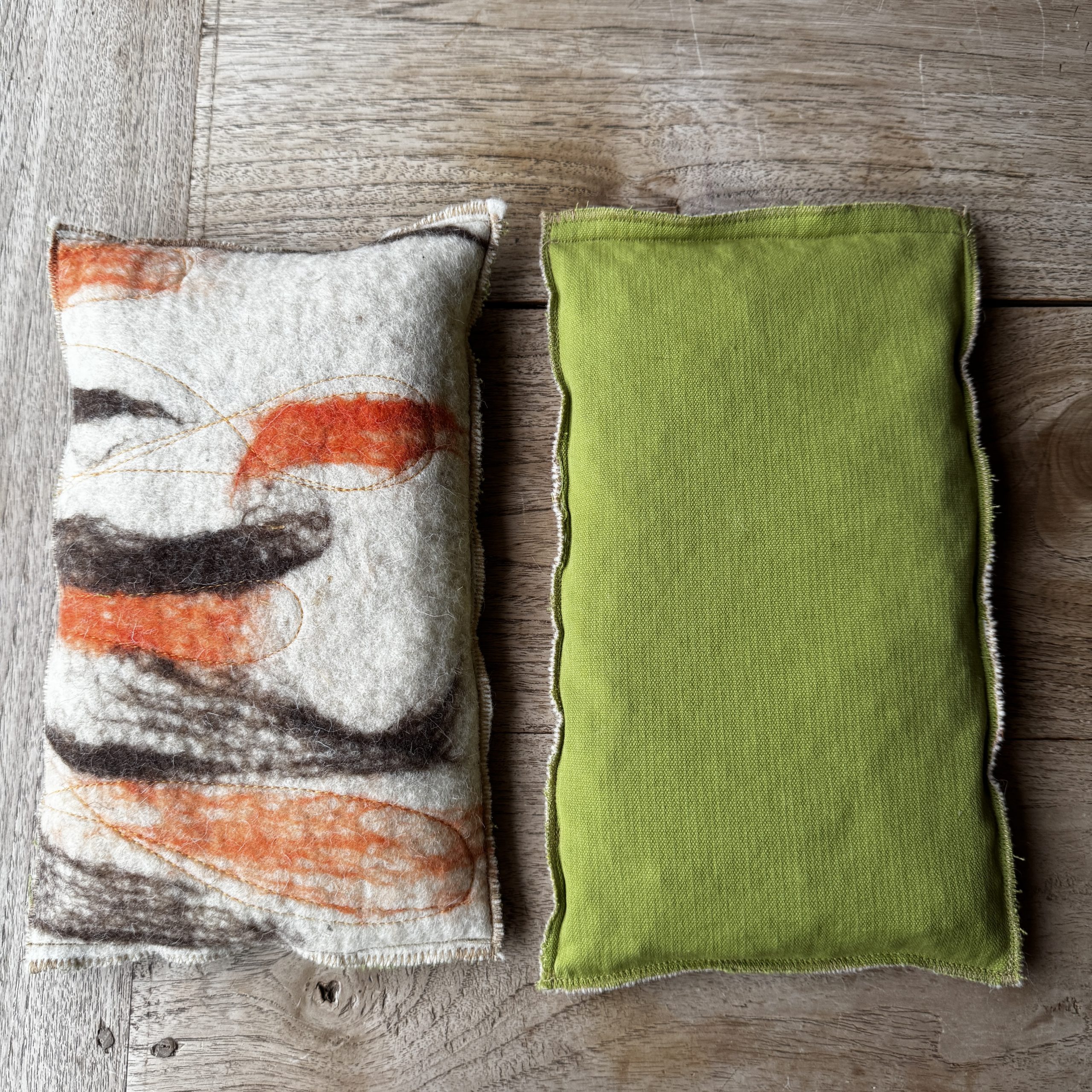 Un sac tèrmic amb dues cares i dues funcions. Per calent o fred amb teixit de llana i cotó, i farcit amb pinyols de cirera.