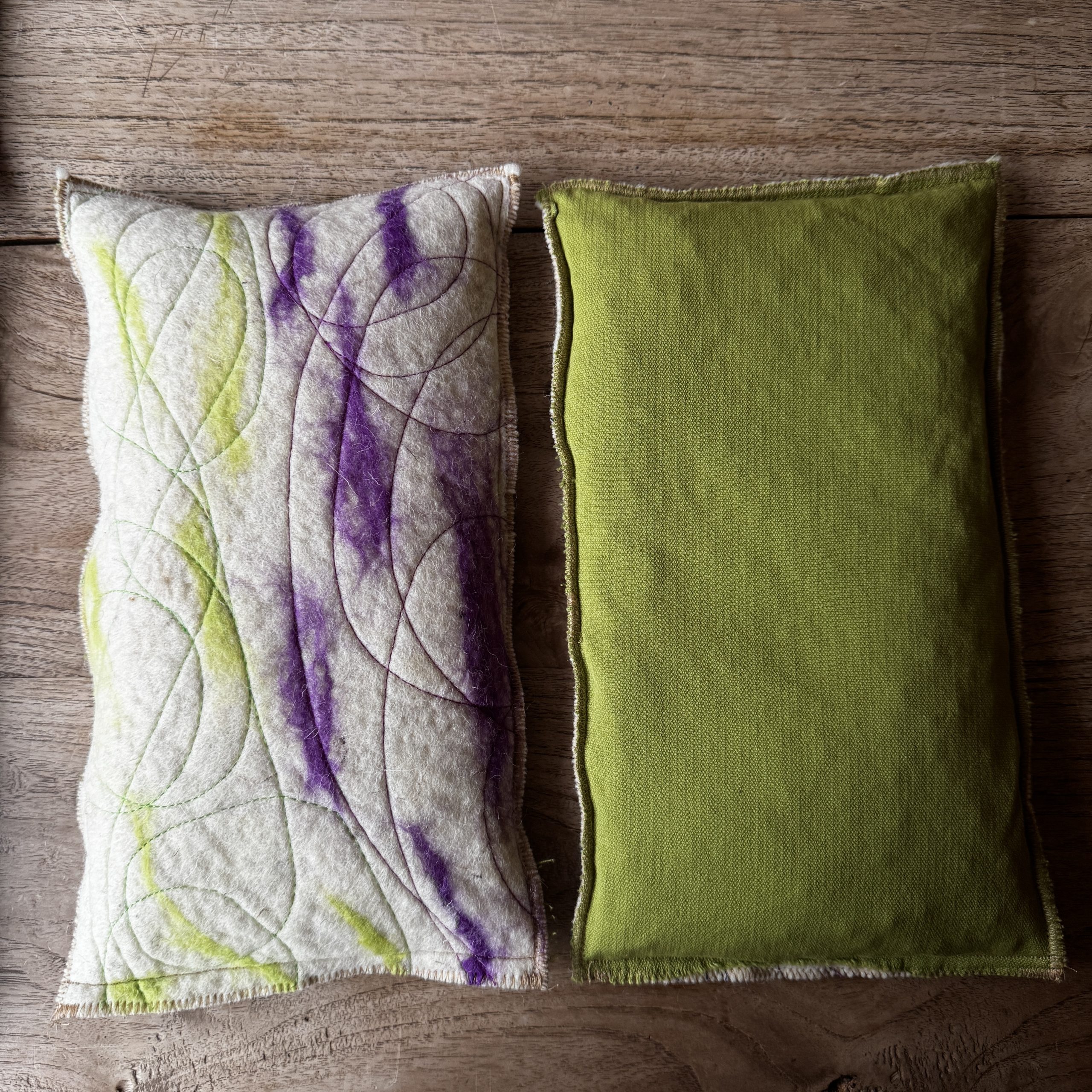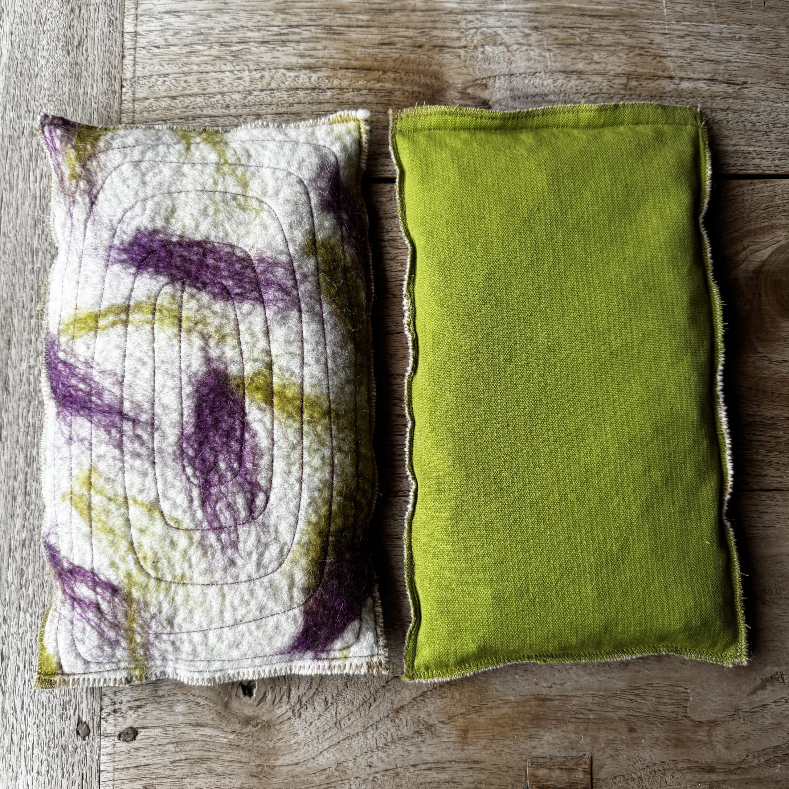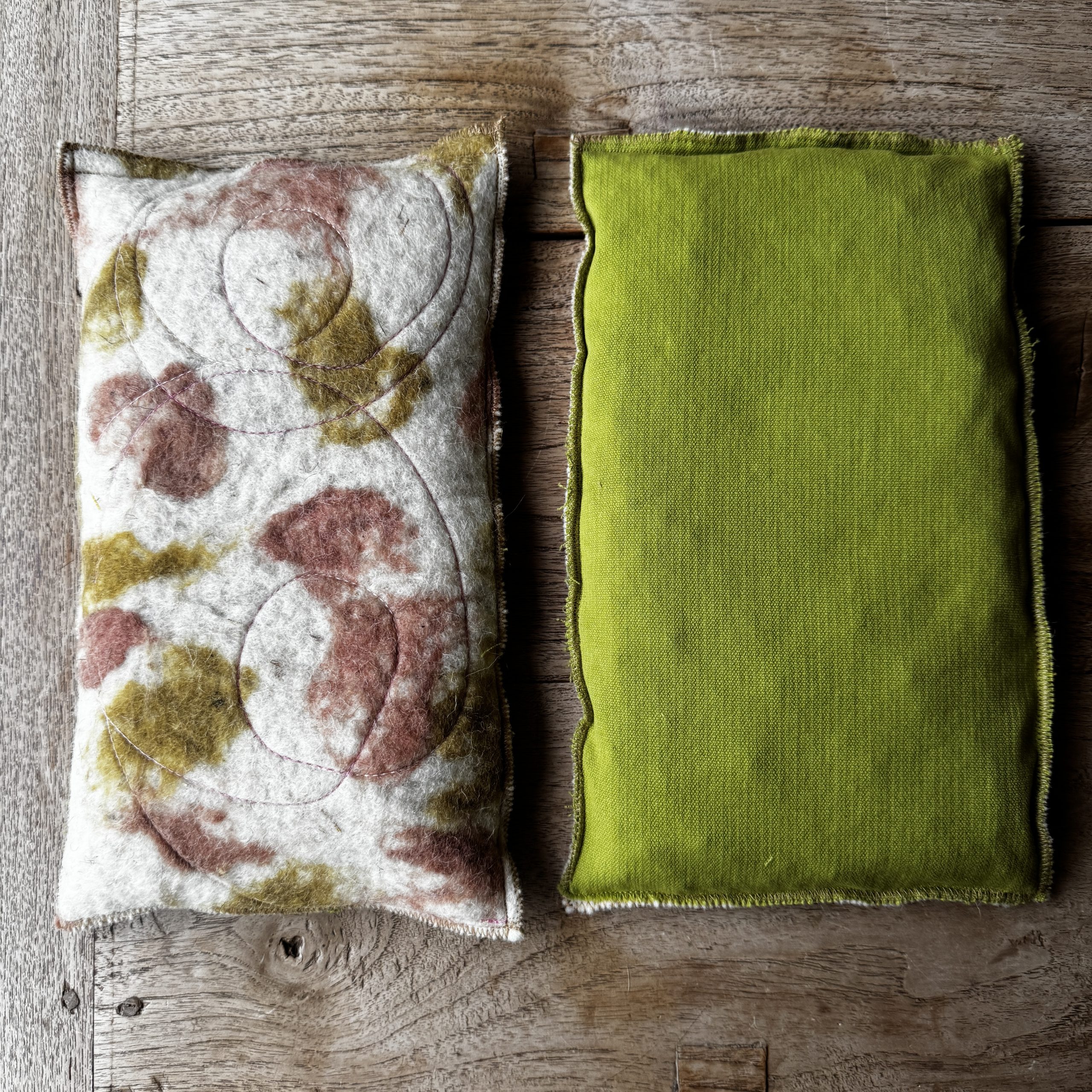 Un sac tèrmic amb dues cares i dues funcions. Per calent o fred amb teixit de llana i cotó, i farcit amb pinyols de cirera.